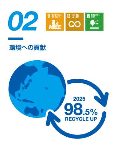 地球環境の維持・改善にわずかでも貢献するため、産業廃棄物の再資源化率向上、CO₂排出量削減に向けて取り組んでいます。 再資源化率向上については、2025年度は98.5%となり、直近5年間での最高値を僅かながら更新しました。CO₂排出量削減については、793t-CO₂となり、前年比1.7%増となりました。これは売上増に伴う燃料使用量の増加が影響しています。 今後、更なる向上を目指してまいります。