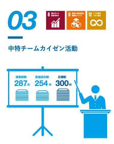 安全衛生の向上、業務の効率化、コスト削減、省資源・省エネ・環境美化、そして社員の改善意識向上を目的として、改善提案制度を導入し、継続的に活動を行っています。 2024年度の提案件数は287件、実施採用件数は254件となり、目標の300件には届かなかったものの、前年度比で約30%増加しました。 提案内容も年々充実しており、ヒヤリハットへの対応策や品質トラブル解決に関する提案が増えるなど、提案の質の向上も見られます。 2025年度も引き続き、社員一人ひとりの改善意識を高めるため、制度の改訂を行い、PDCAサイクルを着実に回しながら、質・量ともに充実した改善活動を推進してまいります。