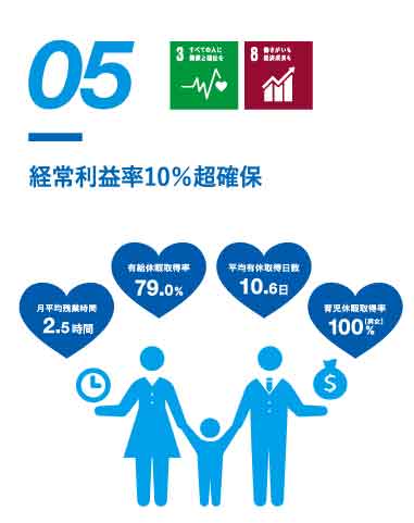 働き方改革、労働生産性向上「働き方改革推進に関する方針」を掲げ、社員一人ひとりのワークライフバランスの向上と、健康で充実した生活の実現を支援しています。 長時間労働を前提としない職場づくりに取り組み、育児休暇取得率は昨年に引き続き100%を達成。育児と仕事の両立を積極的に後押ししています。 また、勤怠管理システムを活用した労働時間の正確な把握に 加え、業務のデジタル化と標準化を推進し、効率化と生産性の向上に取り組んでいます。