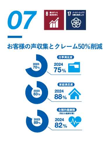 近年、企業経営においては「社員の心身の健康」や「生活の幸福度」といった観点から、ウェルビーイングの概念がますます重要視されています。 ウェルビーイングの視点から会社の現状や課題を把握し、働きがいのある職場づくりや福利厚生・制度設計に活かすことを目的に、昨年に続き本年もグループ全社員を対象としたウェルビーイングアンケートを実施しました。 仕事満足度および家庭満足度については、「満足・まあ満足」と回答した社員の割合が向上しました。一方で、主観的健康観に関しては「良い・まあ良い」と回答した割合が減少する結果となり、改善の余地があることが明らかになりました。 今後は健康経営の観点から各種取り組みを一層強化し、社員の働きやすさ・働きがいの向上、居心地の良い職場づくりを推進します。こうした取り組みを通じて、社員の定着率向上にもつなげてまいります。