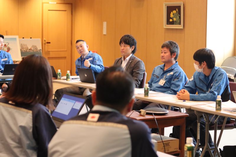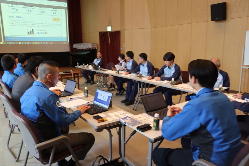 会場には本部長、部長をはじめとするトクヤマ海陸運送8名、中特グループ8名が集まりました。改善提案活動やDX化、地域貢献活動、社内コミュニケーション等が議題に上がり、両社の取り組みや課題点を共有し質疑応答を行いました。