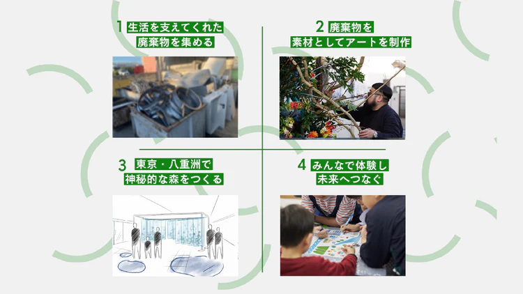 本プロジェクトでは東京の廃棄されるはずだった素材を回収し、アートとして再構築し、未来に繋げます。