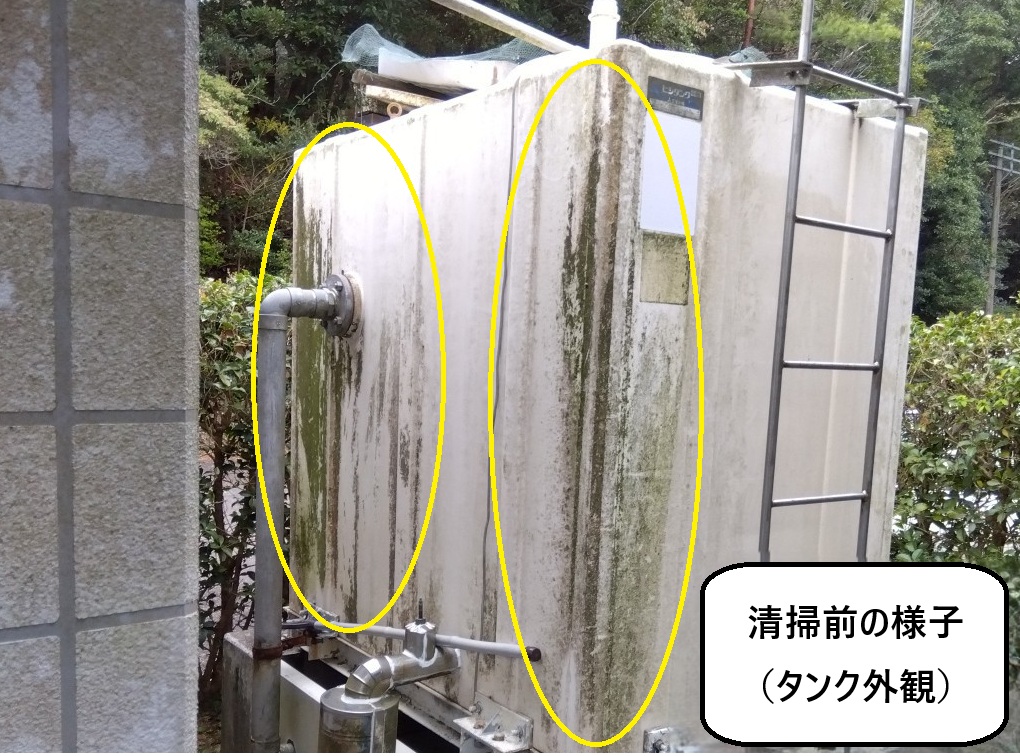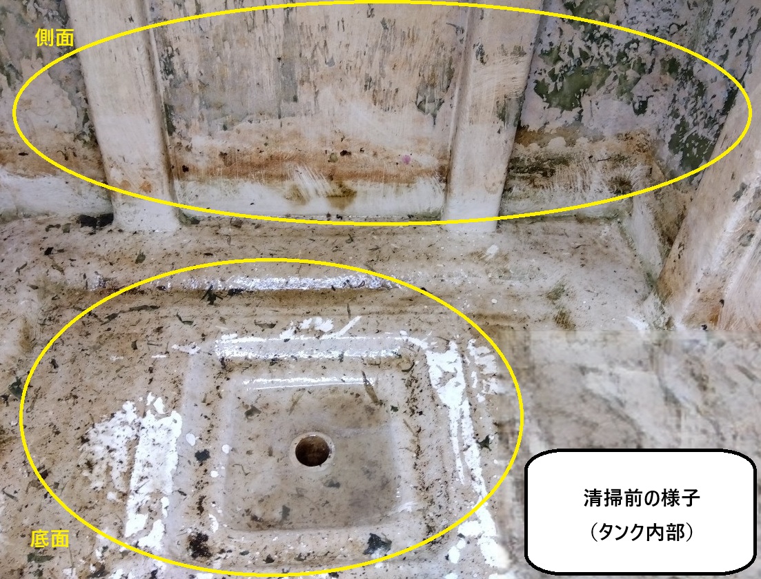 長年にわたる使用で槽の内外が藻に覆われ、表面の汚れはもちろん、内部も沈殿物が多く、衛生面で深刻な状態でした。