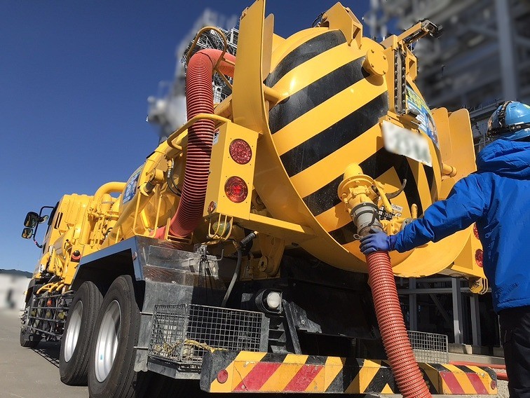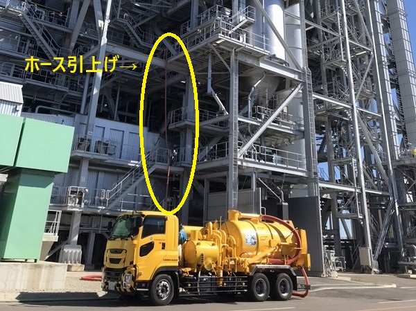 作業は10月下旬に実施。大型強力吸引車を使用し、長いホースを高所まで引き上げて吸引作業を行いました。