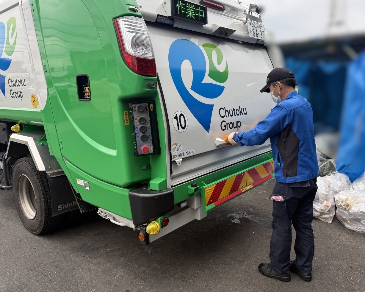 回収場所は駐車場から見える位置にあるため、作業時の見た目や衛生面にも配慮しています。ごみを車両へ積み込んだ後は、積み込み口の扉を閉めた状態で圧縮操作を行うことで、残飯などが飛散したり外から見えたりしないよう工夫しています。店舗をご利用されるお客様にも不快感を与えないよう、細かな配慮を大切にしています。